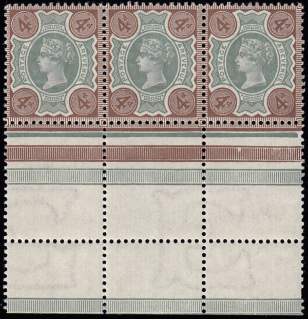 SG205var 1887 4d. Green and deep chocolate brown. Superb unmounted, marginal strip of 3.