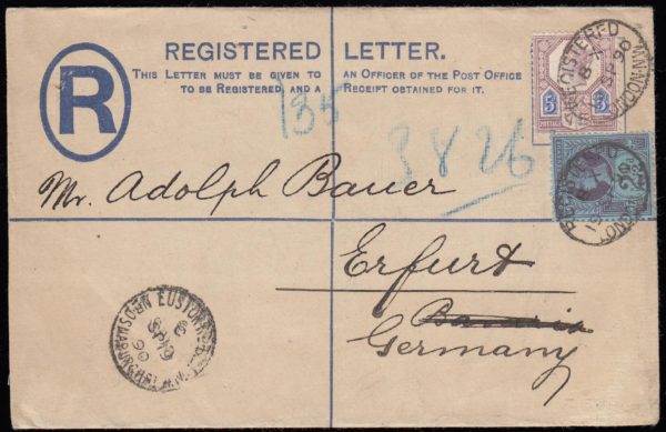 SG207a 1890 2d. Blue registered Stationery envelope, London to Germany.