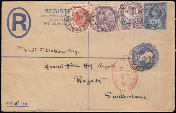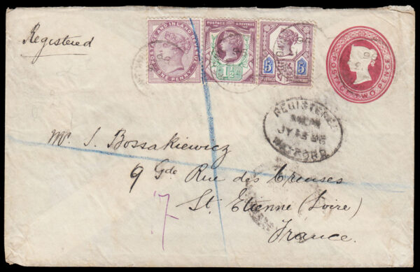 SG207a 1896 2d. Blue registered stationery envelope with additional Jubilee stamps.