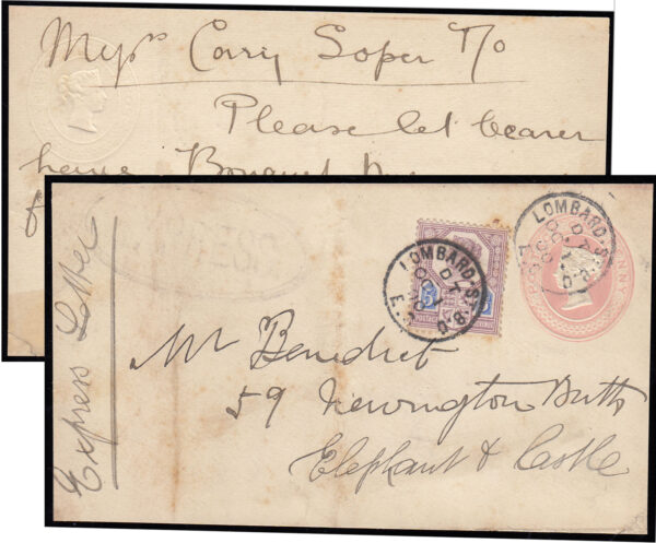 SG270a 1900 1d. Pink stationery envelope, reduced to just the front and used on reverse for a return message.