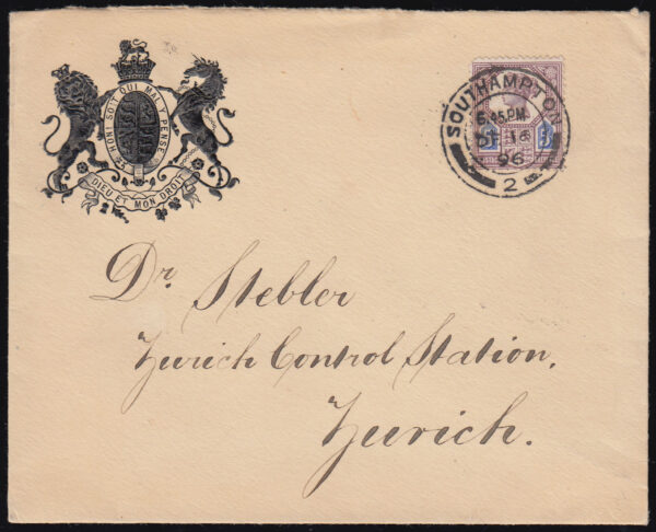 SG207a 1896 5d. Jubilee on superb Royal Coat of Arms embossed envelope, Southampton to Zurich.