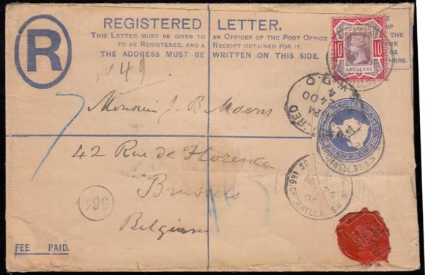 SG210 1900 10d. Purple and carmine on 2d. blue registered envelope.