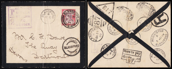 SG210 1901 Mourning cover to Dartmouth with 10d. Jubilee, cancelled by Blandford double ring cds.