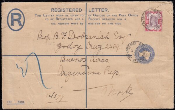 SG210 1899 10d. Jubilee on Registered stationery envelope, Shepherds Bush to Buenos Aires.