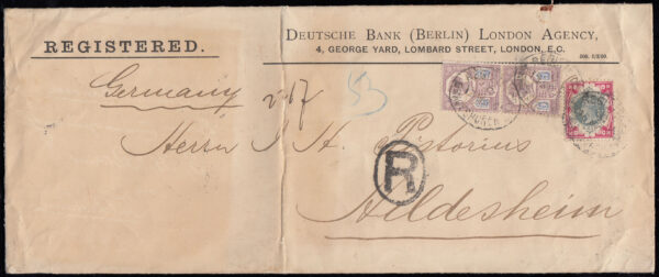 SG214 1901 Registered cover from London to Germany. Deutsche Bank (Berlin) London Agency.