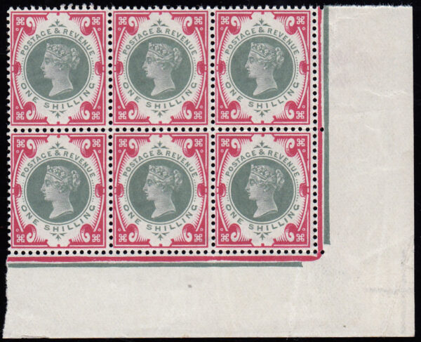 SG214 1900 1/- Green and carmine. Superb unmounted, original gum corner block of 6.