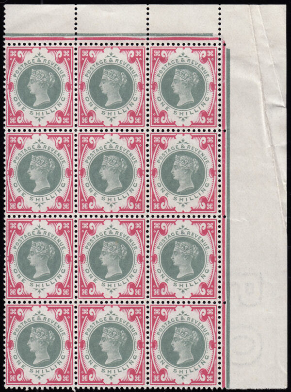 SG214 1900 1/- Green and carmine, superb unmounted, original gum corner block of 12.