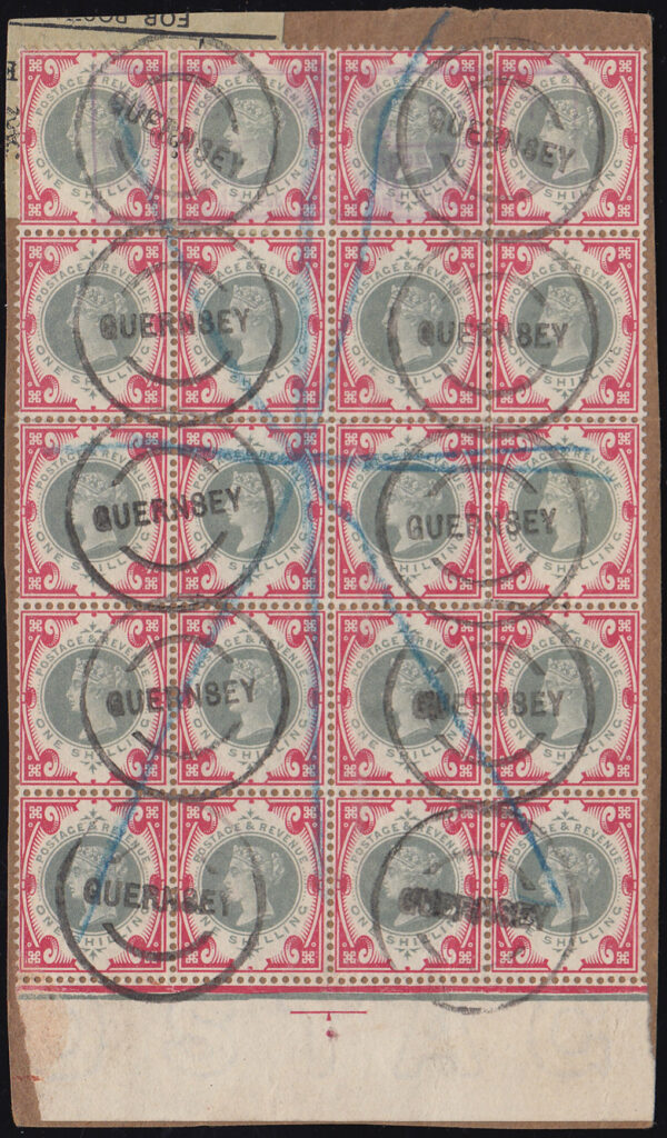 SG214 1900 1/- Green and carmine; lower marginal block of 20, used on piece.