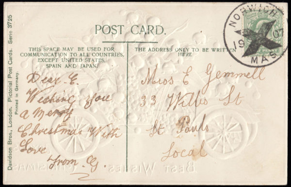 SG217 1904 ½d. Pale Yellowish Green. D.L.R. Superb Christmas postcard depicting a motor vehicle with EDVII ½d. pale yellowish green.