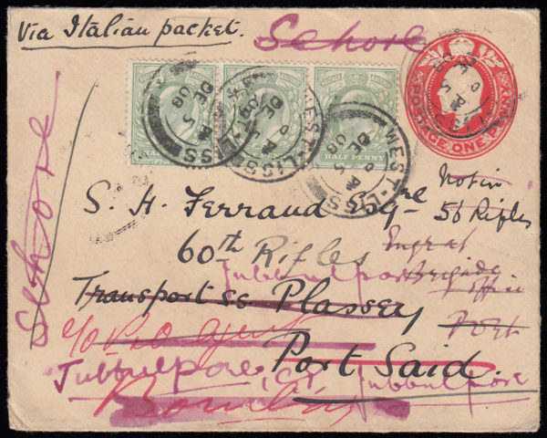 SG217 1904 ½d. Pale Yellowish Green. Stationery cover, WEST-LISS to S.H. Ferraud, 60th. Rifles, PORT SAID “Via Italian packet”