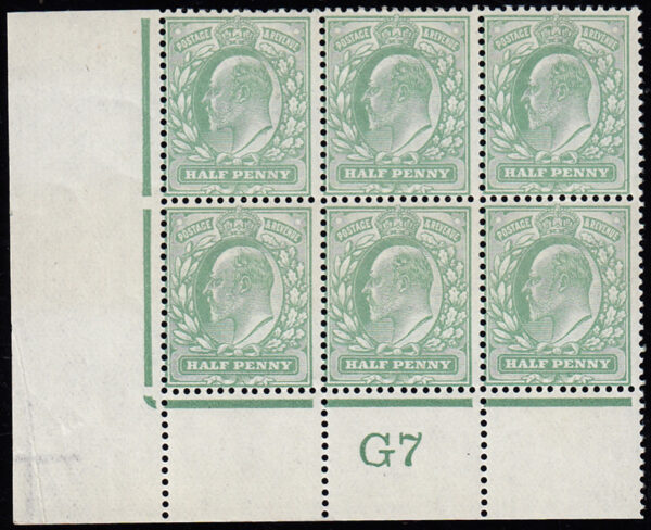 SG217 1907 ½d. Yellow-green, very fine unmounted mint, o.g G7 Control block of 6.