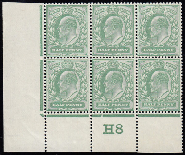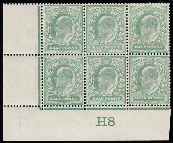 SG217 1908 ½d. Yellow-green, very fine, unmounted o.g Control H8 block of 6, co-extensive rule, perf. type H1.