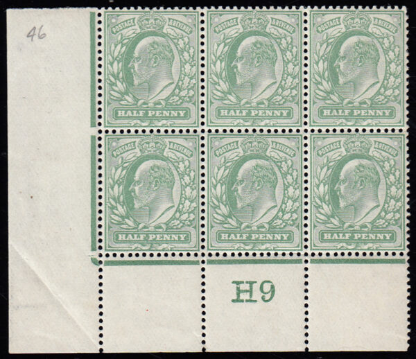 SG217 1909 ½d. Yellow-green, very fine, unmounted o.g Control H9 block of 6, co-extensive rule, perf. type V2.