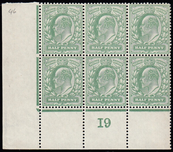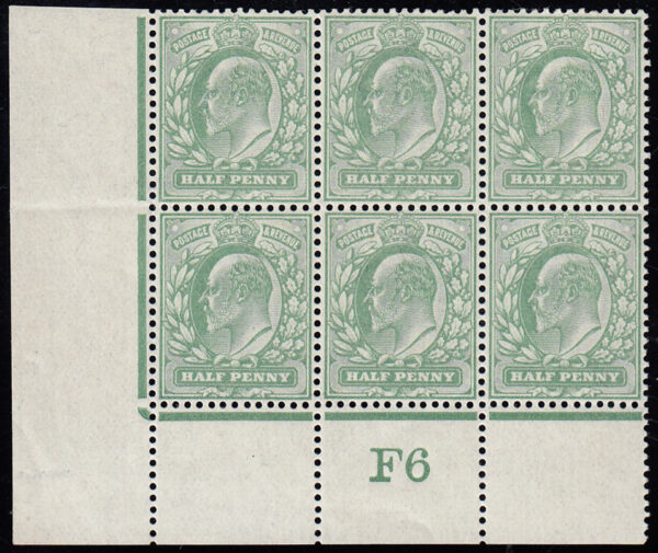 SG217 1909 ½d. Yellow-green, very fine, unmounted o.g Control I9 block of 6, co-extensive rule, perf. type V2.