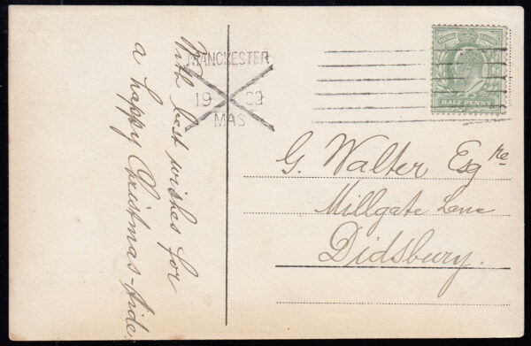 SG217 1904 ½d. Pale Yellowish Green. D.L.R. ‘POSTED IN ADVANCE FOR DELIVERY ON XMAS DAY R.O. 1904’. Rochdale 2nd Type.