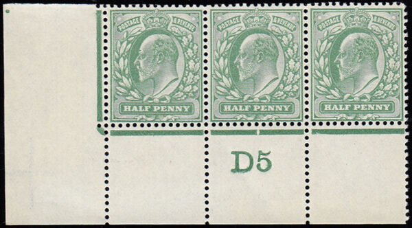 SG217 1905 ½d. Yellow-green, very fine, unmounted original gum control strip D5, perf type H1A.