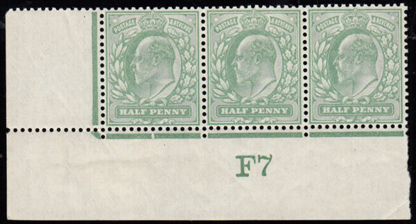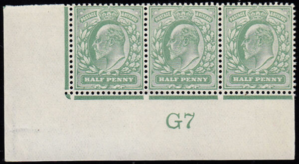 SG217 1907 ½d. Yellow-green, very fine, unmounted original gum control strip of 3 G7 Control, perf type H11.