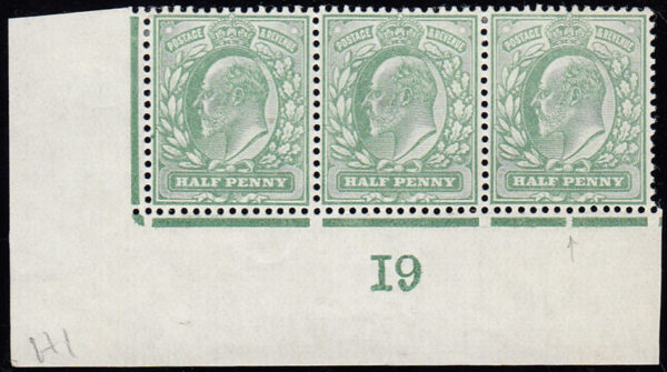 SG217 1909 ½d. Yellow-green, very fine, unmounted original gum control strip of 3 I9 Control, perf type H1.