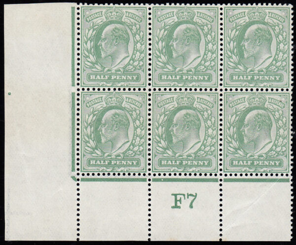 SG217 1907 ½d. Yellow-green, very fine, original gum F7 control block of 6. Perf type V2.