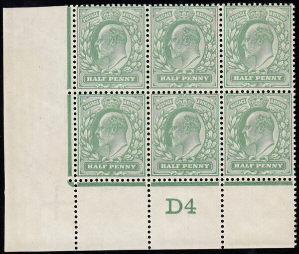 SG217 1904 ½d. Yellow-green, very fine, unmounted, original gum D4 control block of 6. Perf type H1A.