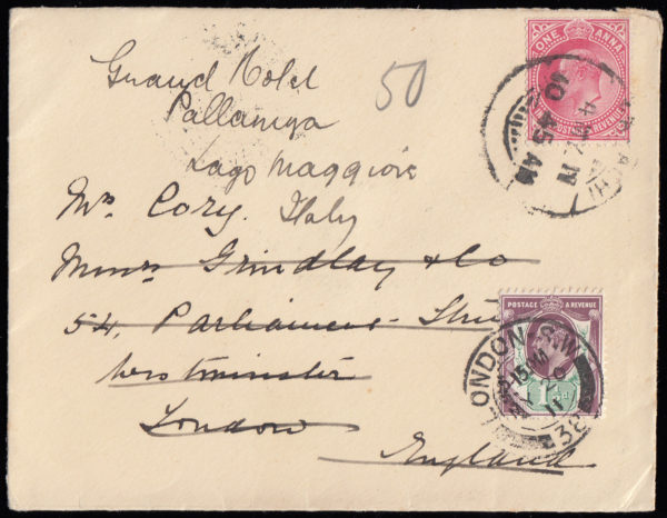 SG224var 1911 1d. Anna India on cover to London, re-directed on arrival to Italy.