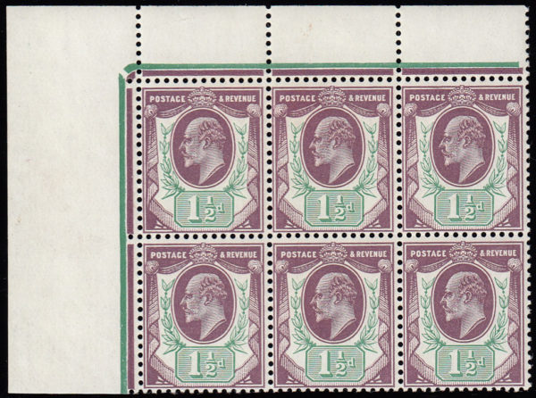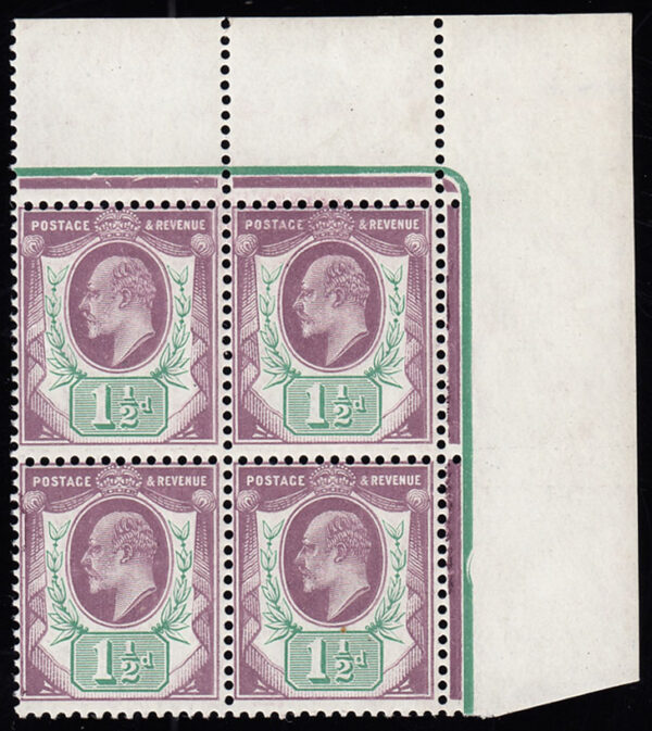 SG224var 1905 1½d. Deep Slate Purple and Bluish-green (Chalky). Superb unmounted, original gum corner block of 4.