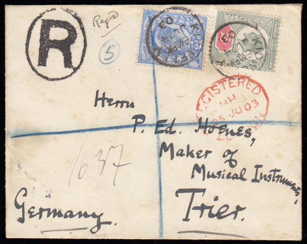 SG225 1902 Registered envelope addressed to Trier, Germany.
