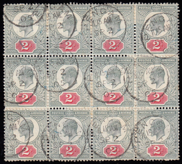 SG226 1905 2d. Grey-green and carmine red. Very fine cds used block of 12.
