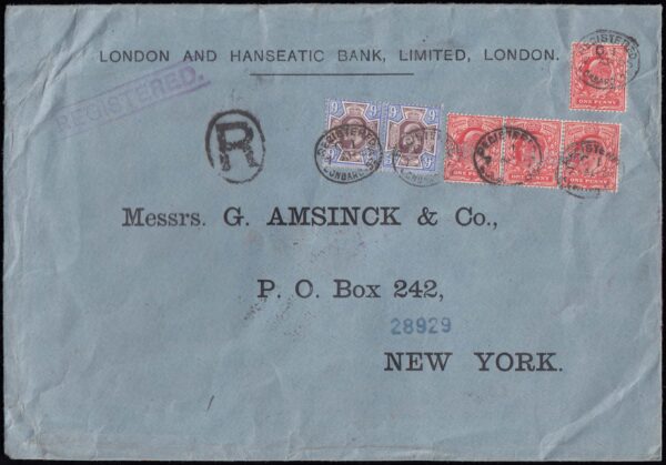 SG250var 1905 9d. Slate purple and deep ultramarine pair on Registered envelope.