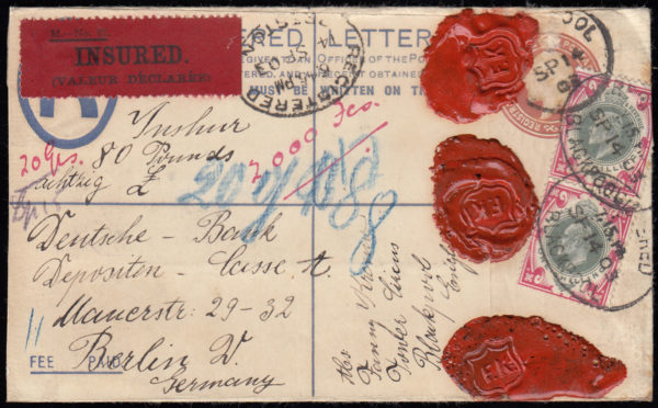 SG257var 1903 Insured registered envelope from Blackpool to Berlin.