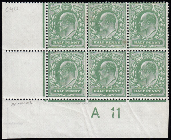 SG269 1911 ½d. Deep dull green Harrison p.14. Very fine, o.g (mounted mint on two) A11 Control block of 6.