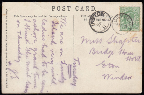 SG269 1911 ½d. Deep dull green Harrison p.14 on ppc of Lundy Island to Windsor.