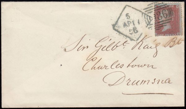 SG26var 1856 1d. Red-brown on cover, Dublin to Drumsna, Co. Leitrim (Ireland).