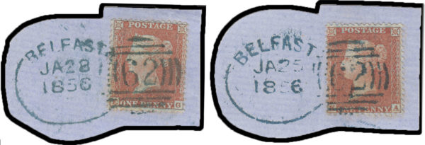 SG26var 1856 Belfast Spoons, type A and type B on small pieces in blue ink.
