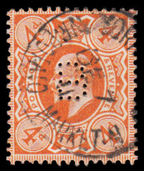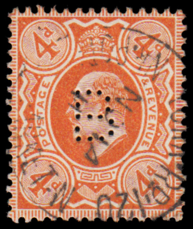 SG278var 1911 4d. Deep Bright Orange. Harrison. P.14. Perfin “B”.