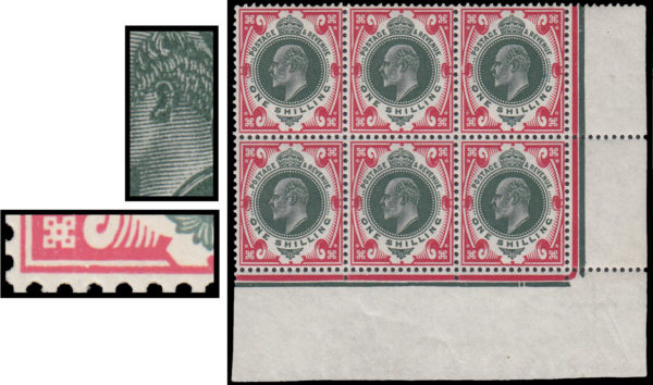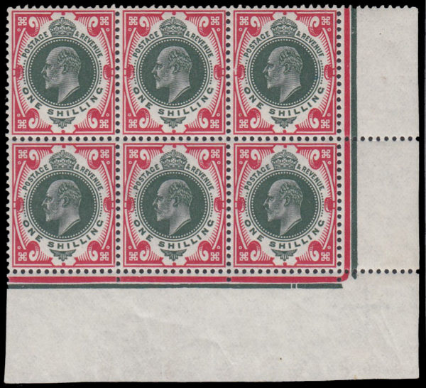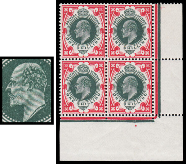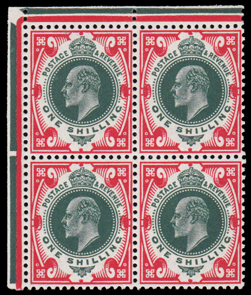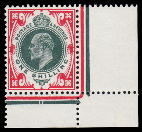SG314 1912 1s. Green and Carmine. S. House. Very fine unmounted o.g. bottom right corner marginal with date cuts under “H”.