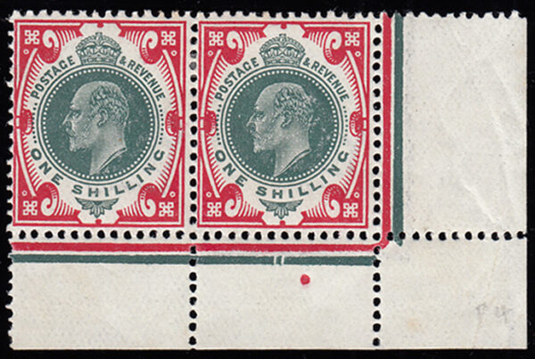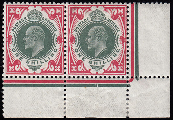 SG314 1912 1s. Green and Carmine. S. House. Superb unmounted o.g. bottom right corner marginal with dates cuts
