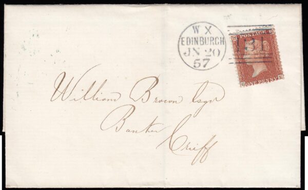 SG33 1857 1d. Orange-brown, GE, Die II, LC. P14, pl. 32, wrapper from Edinburgh to Crieff.