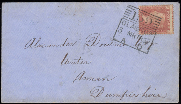 SG29/ 33 1857 1d. Pale red (spec C8) on neat envelope, Glasgow to Annan, Dumfrieshire.