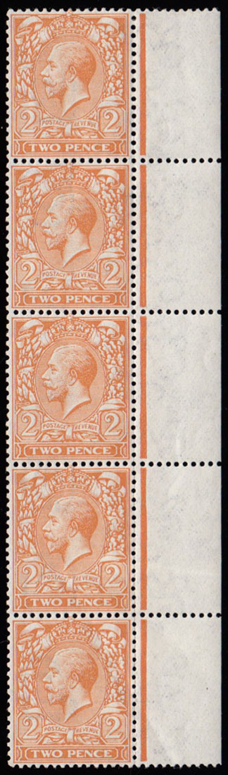 SG368 1912 2d. Orange. Die 1. Royal Cypher. Off-set Unmounted o.g. bottom marginal showing “TWO PENCE” on reverse. Nice variety.