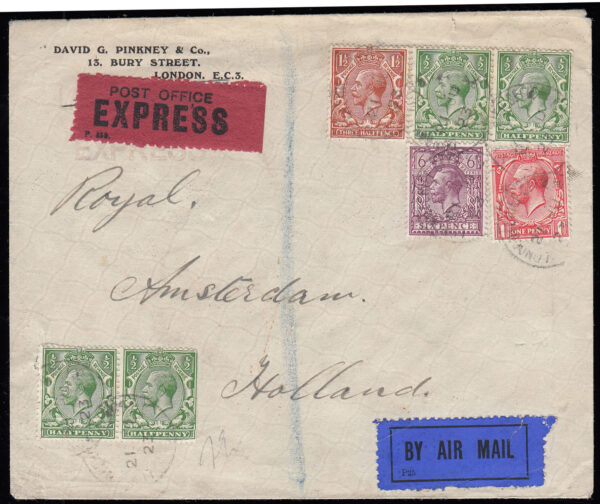 SG384 1923 Airmail Express envelope Lanto Holland 10½d. paid.