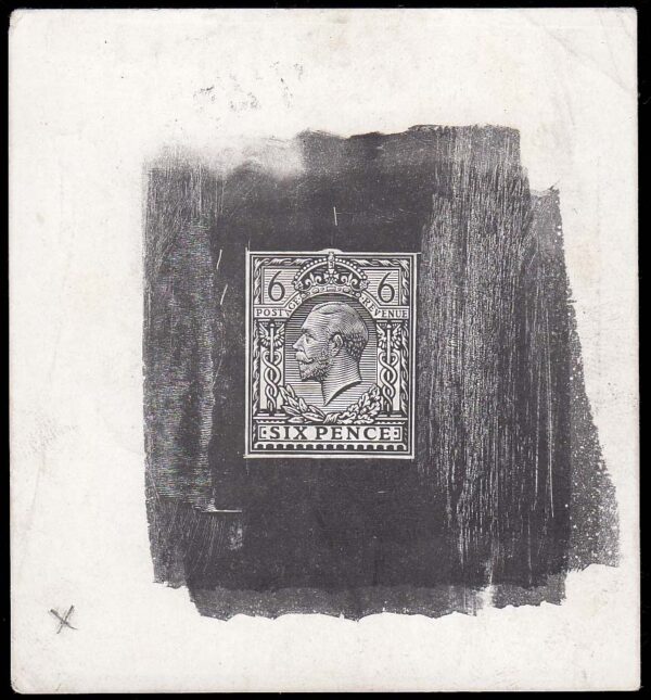 SG385 1913 6d. Die proof, uncleared in black on glazed card, date on reverse, 28.5.13.