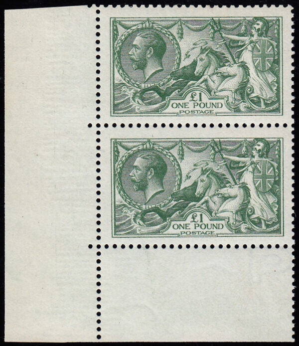 SG403 1913 £1 Green. Brilliant unmounted, original gum corner pair.