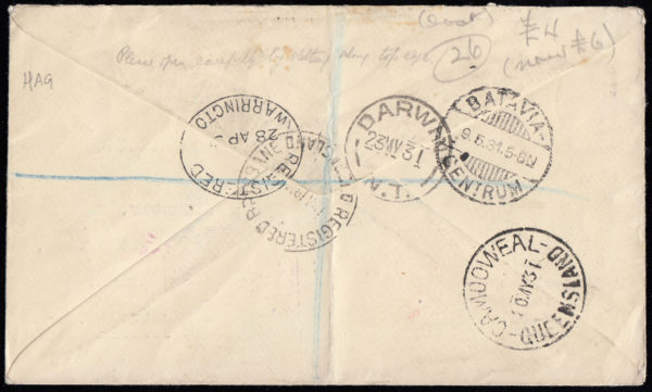 SG413a 1931 Registered Airmail envelope, Warrington to Australia via Holland.