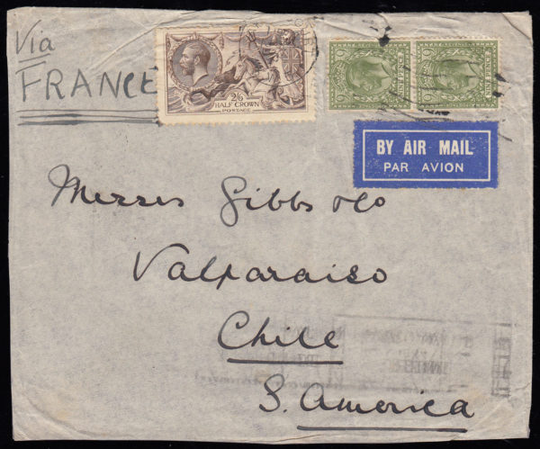 SG413a 1918 2s.6d. Olive-brown. Bradbury “Sea Horse” and SG429 1s Block Cypher. Used on AIr Mail envelope from Glasgow to Brazil.