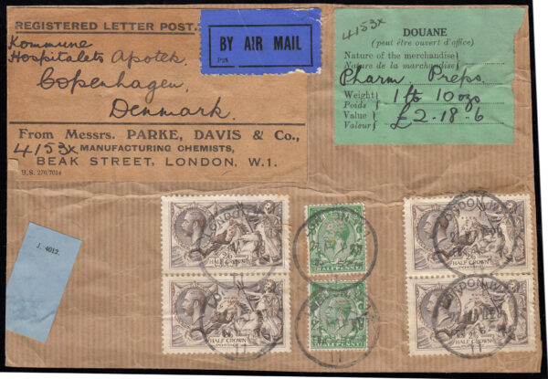 SG413a 1929 London to Denmark label with 2/6d. x4 and 2x ½d.’s. All perfined “P”.
