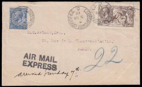 SG413a/ 415 1919 Air Mail Express envelope, London to Paris.