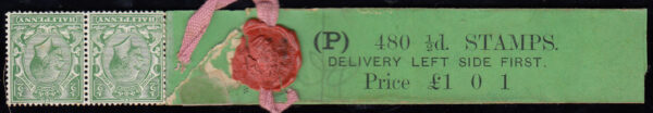 SG418a 1924 ½d. Green Sideways watermark Coil Leader, code P, with 2 stamps attached.