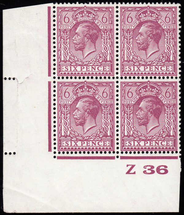 SG426var 1924 6d. Deep reddish purple, chalky paper, Z36 control block of 4.