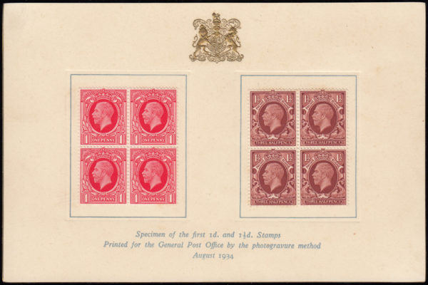 SG440 1934 Photogravure 1d. & 1½d. blocks affixed to Harrison presentation card.